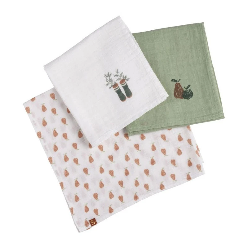 Ces langes ravissants proposent 3 imprimĂ©s distincts, coordonnĂ©s au reste de la collection Botanica de Sauthon : lâun est parsemĂ© de poires orangĂ©es, le second est Ă©cru avec un imprimĂ© de bottes, et le dernier est uni orange avec une poire et une pomme.