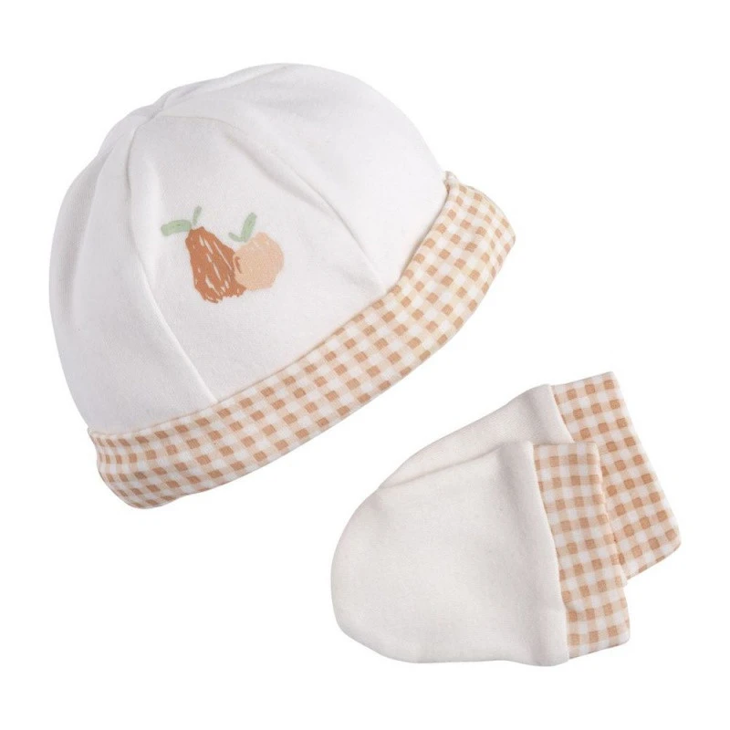ĂlĂ©gants et modernes, le bonnet et les gants associent un adorable imprimĂ© Ă petits carreaux orangĂ©s, et un uni blanc lumineux dĂ©corĂ© de petits fruits. Petit plus : sa ravissante Ă©tiquette sur le cĂŽtĂ©, signĂ©e dâun S dorĂ©.