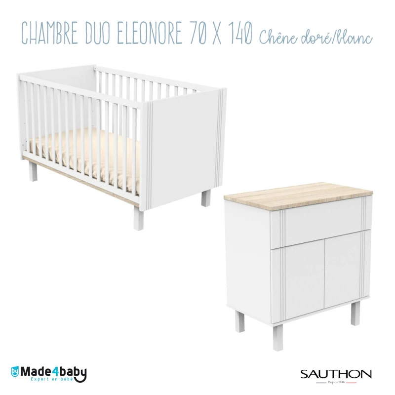 La chambre ElĂ©onore de Sauthon respecte autant lâenvironnent que la santĂ© de nos bouts de chou : elle nâest composĂ©e que de bois certifiĂ© PEFC, avec des produits de finition sans substance nocive. Un choix esthĂ©tique et raisonnĂ© pour offrir un cocon de douceur Ă votre tout-petit !