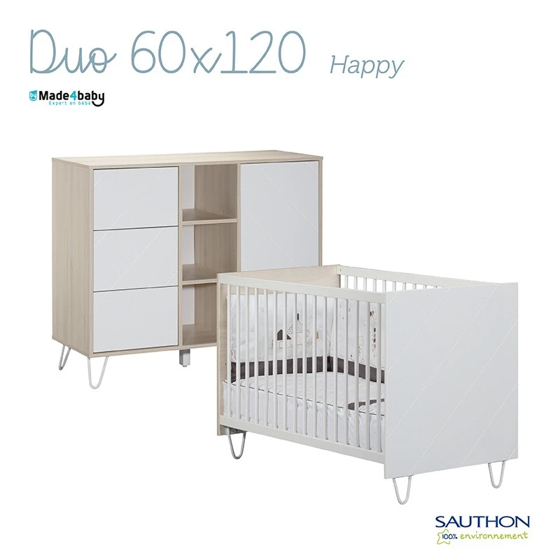 DĂ©couvrez la superbe chambre Happy par Sauthon, un petit Ă©crin de douceur spĂ©cialement Ă©tudiĂ©e pour le confort et la sĂ©cutitĂ© de votre petit trĂ©sor. Grace Ă son design simple et Ă©purĂ©, elle fera le bonheur dâun petit garçon ou dâune petite fille ! Dans les tons de blanc laquĂ© et d’acacia clair, elle est dĂ©corĂ©e par de jolies gravures, et ses beaux pieds en mĂ©tal blanc apportent une jolie touche d’originalitĂ© ! Belle et robuste, la chambre Happy propose des volumes gĂ©nĂ©reux et des prestations Ă la hauteur de Sauthon. Des lignes minimalistes et Ă©lĂ©gantes pour une chambre fonctionnelle qui s’intĂšgrera dans tous les univers !