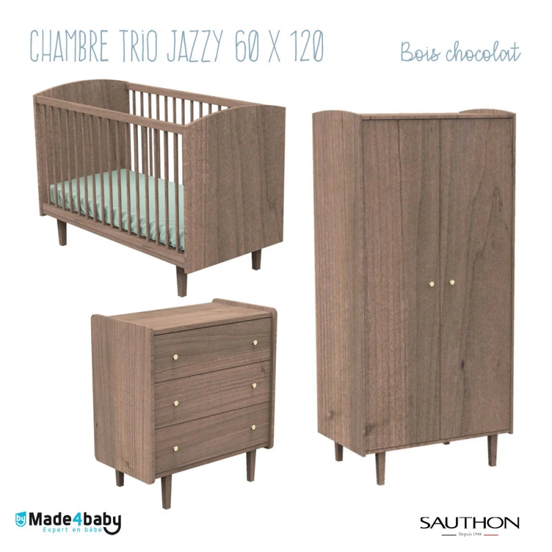 Vous allez fondre pour la chambre Jazzy de Sauthon avec son dĂ©cor bois chocolat, une couleur gourmande qui rĂ©chauffe immĂ©diatement lâatmosphĂšre et sâintĂšgre aisĂ©ment Ă toutes les ambiances, des plus claires au plus foncĂ©es, des plus sobres aux plus chamarrĂ©es. Aussi, la marque française a rĂ©uni dans ce trio magnifique, le lit 60 x 120 prĂȘt Ă accueillir votre enfant de sa naissance Ă 3 ans environ, la commode 3 tiroirs et lâarmoire 2 portes.