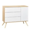 La commode ElĂ©onore de Sauthon peut aussi devenir un meuble de toilette extrĂȘmement pratique, en la complĂ©tant du dispositif Ă langer correspondant, vendu sĂ©parĂ©ment : il agrandit le plateau supĂ©rieur de la commode, il permet de positionner face Ă vous un matelas Ă langer maintenu en sĂ©curitĂ© par les traverses latĂ©rales, et de changer ainsi bĂ©bĂ© facilement, avec tout le nĂ©cessaire Ă portĂ©e de main dans les tiroirs.