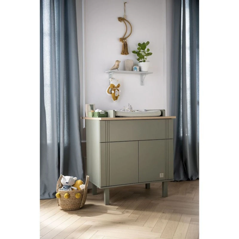 La commode ElĂ©onore de Sauthon peut aussi devenir un meuble de toilette extrĂȘmement pratique, en la complĂ©tant du dispositif Ă langer correspondant, vendu sĂ©parĂ©ment : il agrandit le plateau supĂ©rieur de la commode, il permet de positionner face Ă vous un matelas Ă langer maintenu en sĂ©curitĂ© par les traverses latĂ©rales, et de changer ainsi bĂ©bĂ© facilement, avec tout le nĂ©cessaire Ă portĂ©e de main dans les tiroirs.