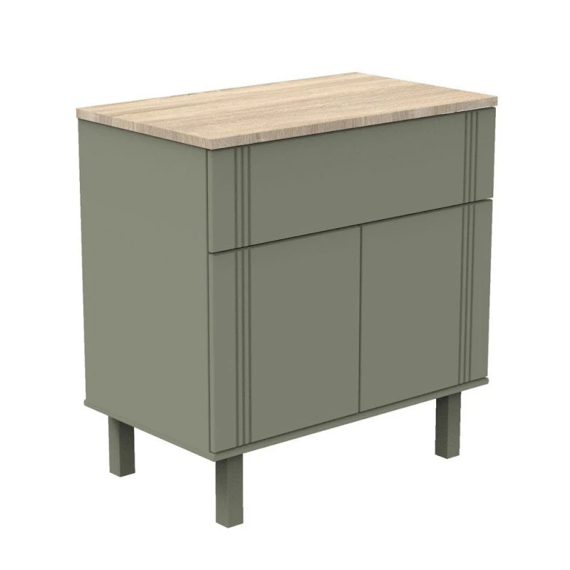 - Portes, face tiroir, cotés, et dessous en panneaux de fibres moyenne densité (MDF) laqués Kaki.
