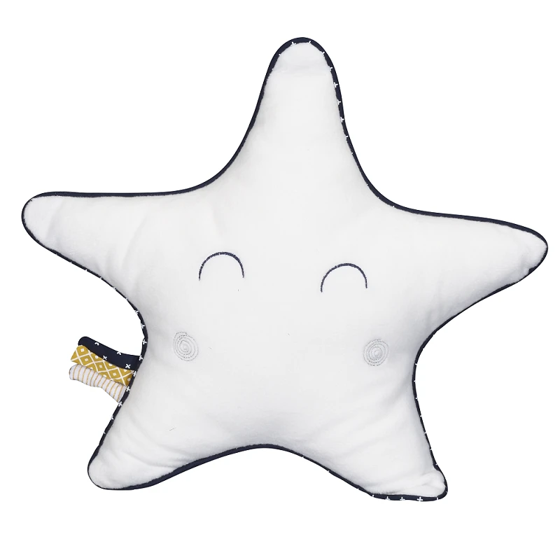 DĂ©couvrez le joli coussin dĂ©coratif en popeline imprimĂ©e et velours assorti Ă la collection Hello par Sauthon. Dans les tons de blanc avec un joli liserĂ© marine, ce beau coussin en forme d’Ă©toile est trop mignon avec ses yeux endormis et ses pomettes en spirale ! Tout doux et moelleux, bĂ©bĂ© sera ravi de se coucher dessus ! CoordonnĂ© aux autres Ă©lĂ©ments du thĂšme Hello, il apportera une touche de dĂ©co dans la chambre de l’enfant. Un beau cadeau original qui fera autant plaisir Ă bĂ©bĂ© quâĂ ses parents !