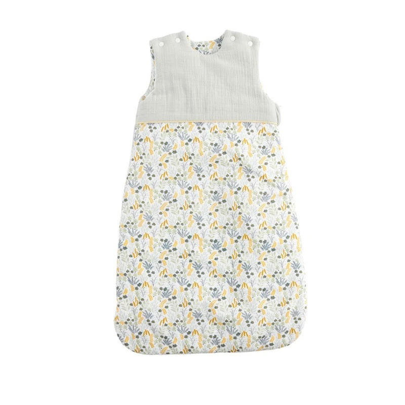 Cette jolie gigoteuse de la collection Promenons-nous est destinée aux enfants entre 0 et 6 mois. La marque Sauthon a choisi de lui donner un look résolument moderne en optant pour un magnifique imprimé végétal, associé à un tissu uni sur le plastron, le tout dans une déclinaison de couleurs naturelles, vert, bleu et jaune.
