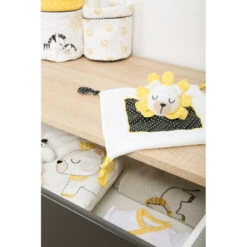 Associant harmonieusement le blanc, le noir et le jaune lumineux, le lot de 3 panières gigognes Sauthon Pluche et Pompon est aussi joli posé sur une étagère par exemple, que pratique pour organiser vos produits de toilette sur votre table à langer : brosse, peigne, ciseaux, mouche-bébé, couches, crèmes, lingettes… Une place pour chaque chose, et chaque chose à sa place !