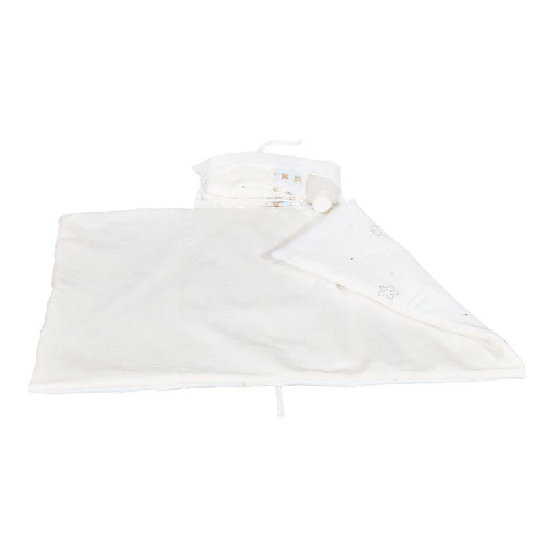 Ce matelas Ă langer de voyage assorti Ă la collection Babyfan par Sauthon est trĂšs pratique pour changer bĂ©bĂ© ou que vous vous trouviez ! Elle se pose sur toutes les surfaces pour les protĂ©ger (les draps dâun lit par exemple) ou pour protĂ©ger bĂ©bĂ© des surfaces froides et des bactĂ©ries. FabriquĂ©e dâun cĂŽtĂ© en mousseline de coton bio et de lâautre en Ă©ponge impermĂ©able, ce matelas Ă langer est trĂšs confortable grĂące Ă son espace de change rembourrĂ©. Le matelas Ă langer de voyage est Ă©quipĂ©e dâune poche pour y ranger lingettes, couches, crĂšmes, etc⊠Pratique, il se replie pour prendre la forme dâune pochette Ă glisser dans le sac ! Dans les tons de blanc, il est recouvert d’Ă©toiles et de lunes !