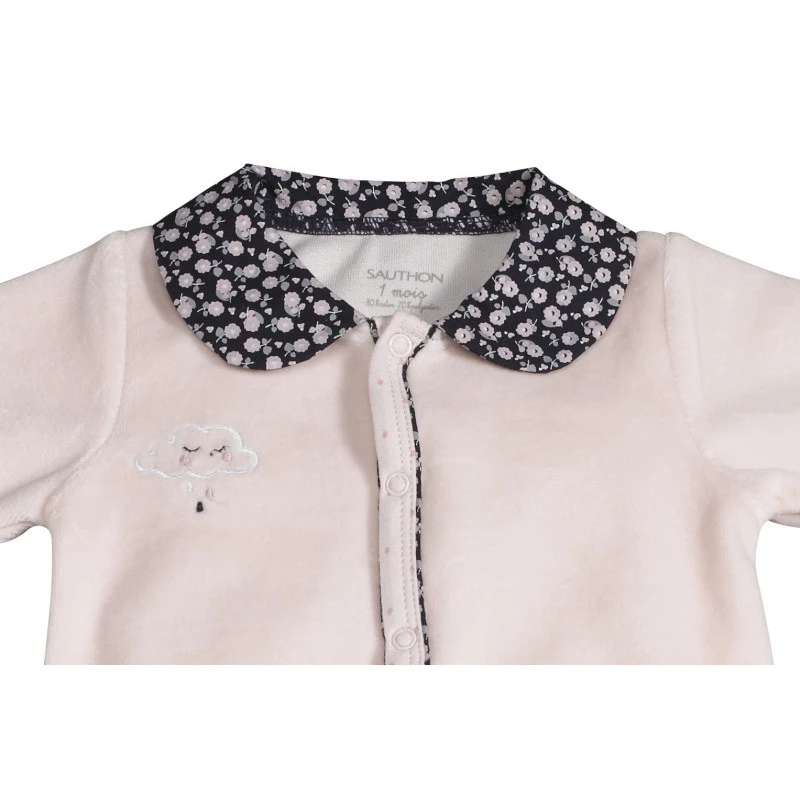 Dans les tons de rose avec un liserĂ© bleu marine, câest un pyjama Ă©lĂ©gant et raffinĂ© avec son joli col Claudine fleuri, son petit nuage endormi et ses petits nĆuds marines sur les pieds. Grace Ă ses manches longues et ses matiĂšres douces et chaudes, bĂ©bĂ© passera de bonnes nuits bien emmitouflé !