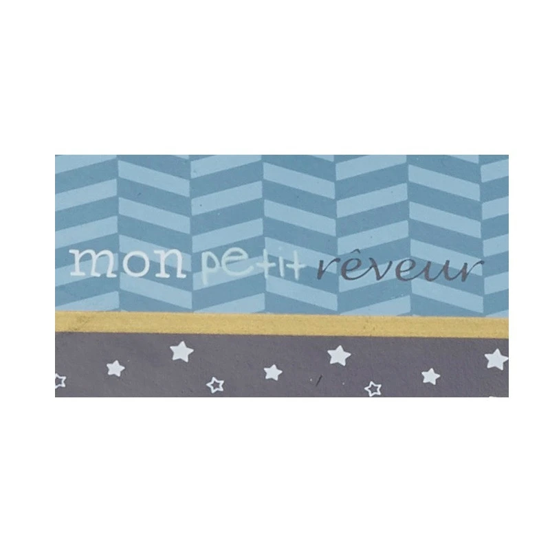 Coloris : bleu ciel, turquoise et bleu marine. Une montgolfiĂšre, un avion et un nuage.
