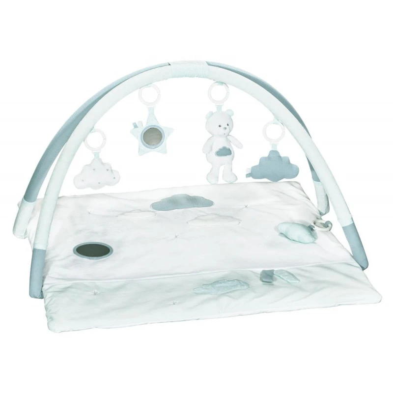 Le tapis d’Éveil assorti au thème Lily par Sauthon est parfaitement adapté pour stimuler les sens de l’enfant grâce aux différentes couleurs et jouets qui le constituent. Tous les jeux d’éveil peuvent être détachés des arches et utilisés comme peluches lorsque bébé aura grandi. Installé confortablement, sur son tapis molletonné, bébé pourra jouer et s’éveiller avec de multiples activités : des miroirs, des hochets, des peluches, etc… Dans les tons de blanc et bleu, on y retrouve le beau petit ours du thème, une petite étoile et deux jolis nuages. Vous pourrez par la suite utiliser le tapis d’éveil sans les arches comme tapis pour amortir les chutes du quatre patte ou des premiers pas grâce à ses arceaux démontables… Super idée cadeau !