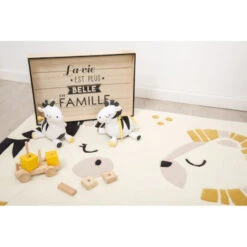 DĂ©couvrez ce magnifique tapis de chambre 90 x 130 cm Sauthon Pluche et Pompon, qui vient ajouter sa touche de fantaisie sur le sol de la chambre. En totale harmonie avec tous les autres produits de la collection Pluche et Pompon, il laisse apparaĂźtre la silhouette des deux insĂ©parables amis : le gros lion tendre Pompon avec sa magnifique criniĂšre jaune dorĂ©e, et lâĂ©lĂ©gant zĂšbre Pluche, tout de noir et blanc vĂȘtu.